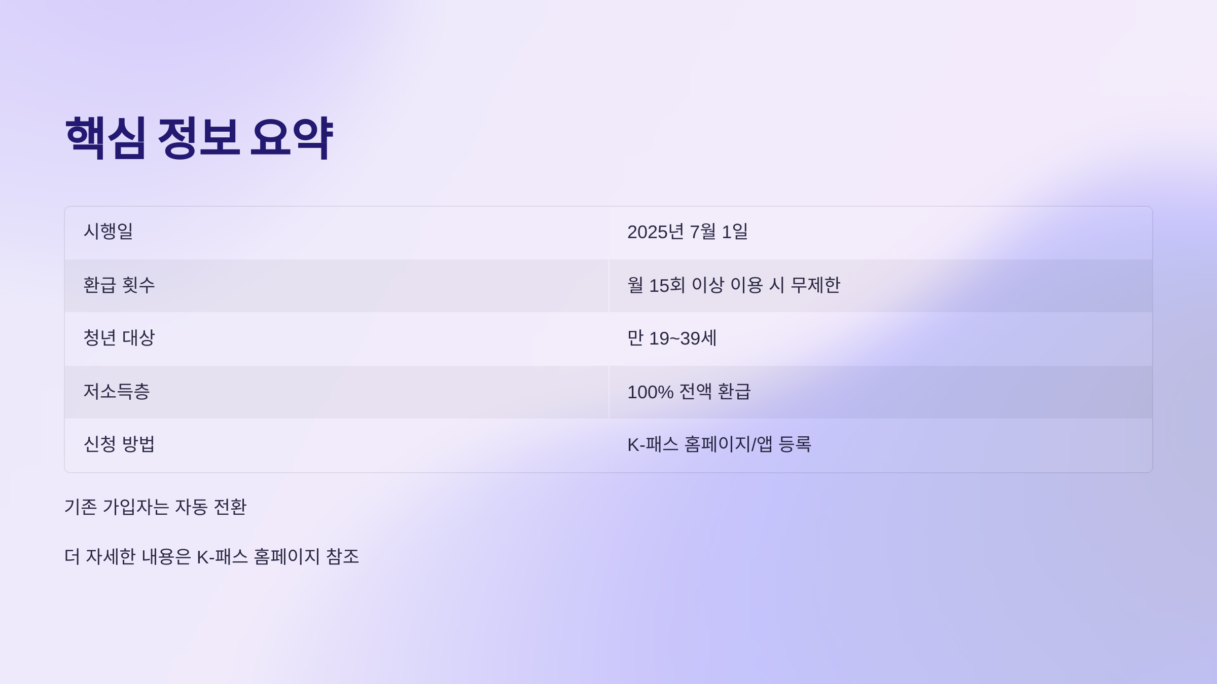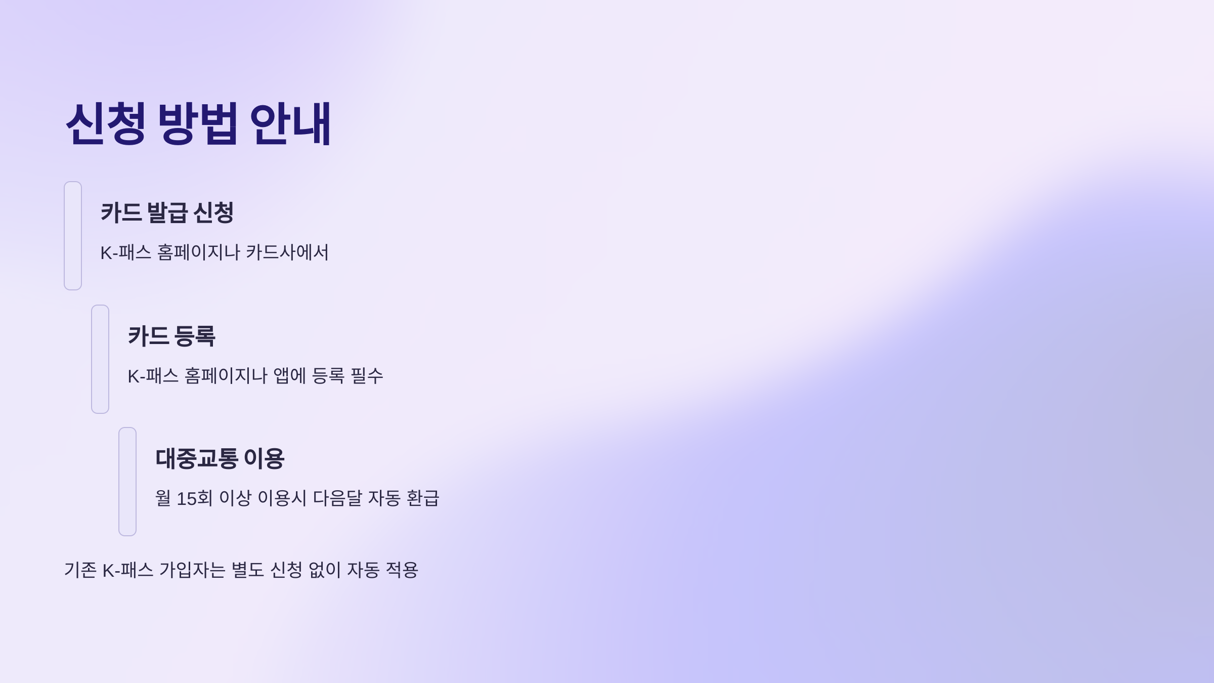 - 신청 방법: K-패스 홈페이지 또는 카드사에서 카드 발급 후 K-패스 홈페이지/앱에 등록 (기존 K-패스 가입자는 자동 적용)