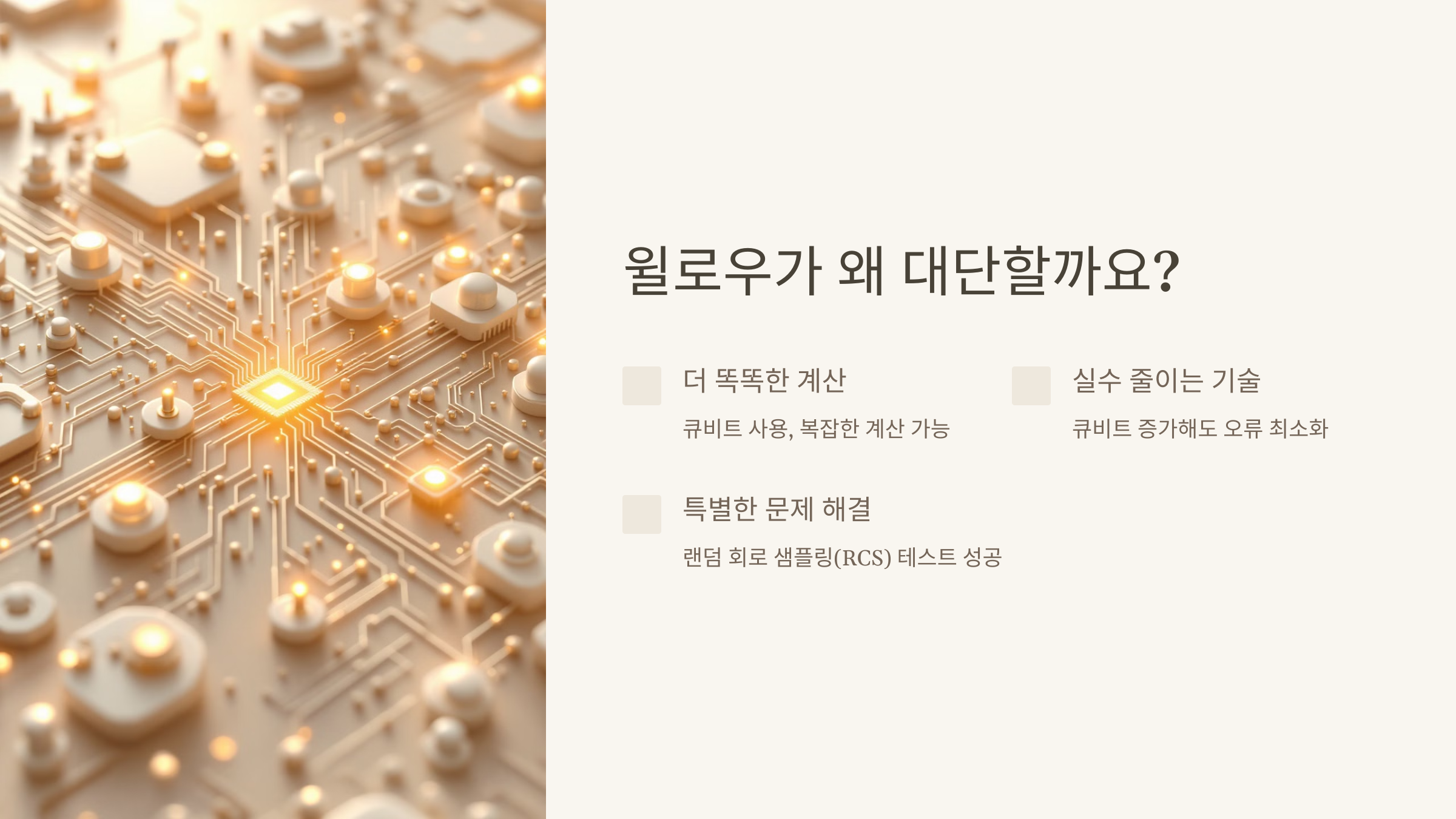 - 랜덤 회로 샘플링(RCS)이라는 테스트를 통해, 윌로우는 보통 컴퓨터가 절대 풀 수 없는 문제를 해결했어요.