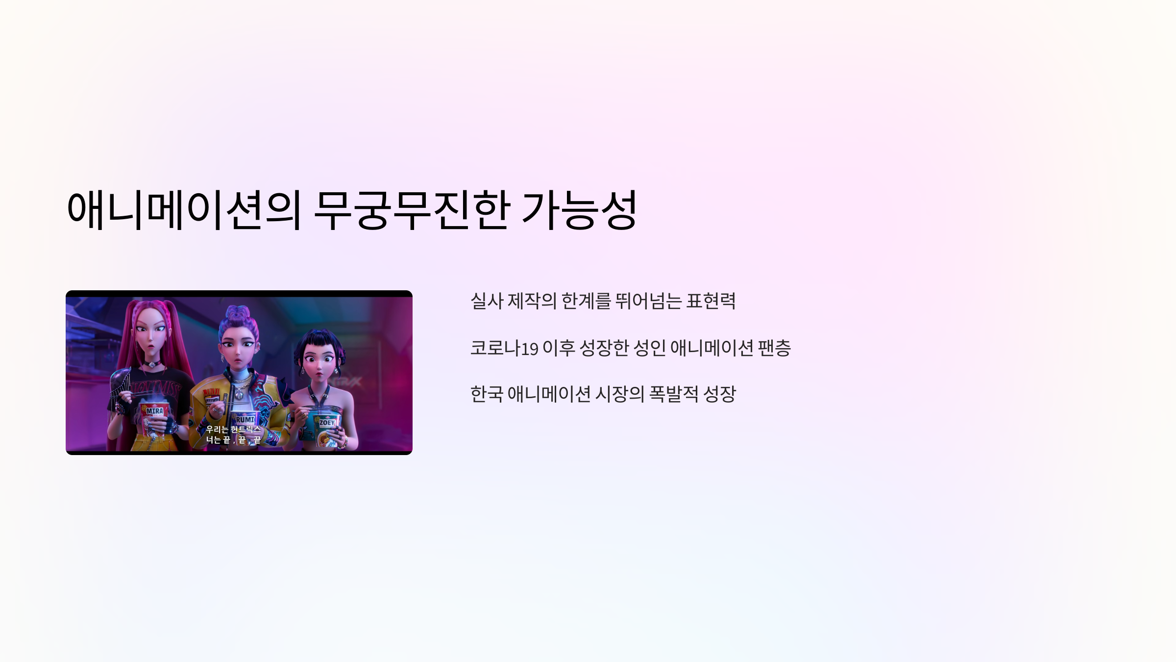 - 애니메이션의 강점 극대화: 실사로는 어려운 상상력 표현과 팬데믹 이후 팬덤 성장